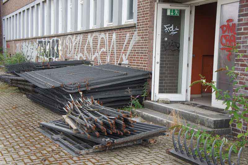 Die rote Backsteinmauer mit ihren beiden gusseisernen Toren gehört zum früheren Bickendorfer Friedhof, der hier von 1854 bis 1945 bestand.