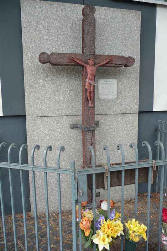 Das Wegekreuz steht seit über 500 Jahren an der Kreuzung. „Am rude Krüz“ ist ein alter Flurnamen, der möglicherweise Bezug nimmt auf einen ehemaligen Versammlungsort oder evtl. auf eine Richtstätte – vielleicht stand hier ein Galgen. Das Kreuz stand bis 1933 auf einer Rasenfläche inmitten der Kreuzung. Nach einer Autokollision kam es in die Obhut der Fa. Lack Kemper.