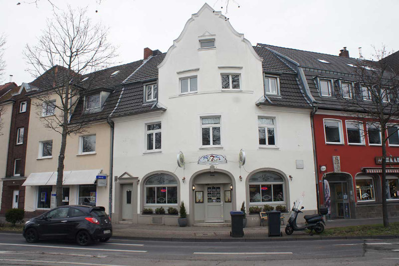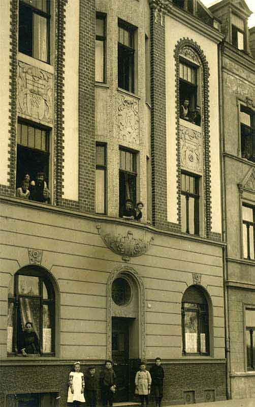 Um 1905 erbautes Wohnhaus. Einfache, flache Stuckverzierungen ober- und unterhalb der Fenster in der 1. Und 2. Etage. Um die Fassade zieht sich ein einfaches Steindekor. In der Dekorleiste über der Parterre steht „Die Gedanken sind frei“.