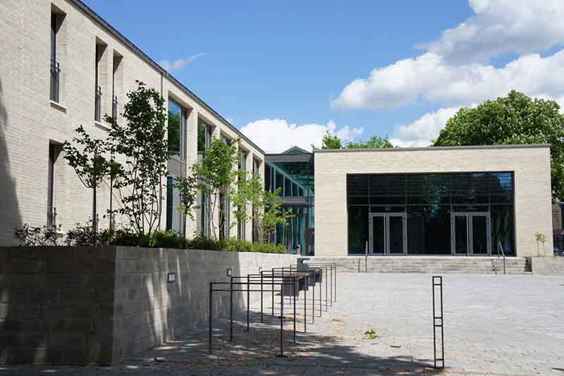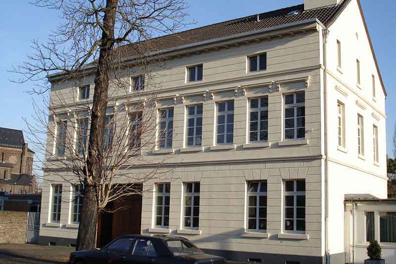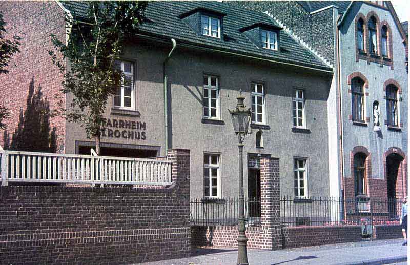 Bereits vor dem Krieg befand sich hier ein Pfarrzentrum mit Pfarr-Häusern und katholischer Volksschule. Alle Gebäude wurden durch die Bomben des 2. Weltkrieges zerstört. Außer der Schule wurden alle Gebäude neu errichtet. Die aus den1950er und 1960 er Jahren stammenden Gebäude waren nicht barrierefrei und stark renovierungsbedürftig. Aus Kostengründen kam eine Sanierung nicht in Frage. Beim Architektenwettbewerb erhielt das Büro Kaspar Kraemer Architekten den Zuschlag. Nach Abriss der Gebäude entstand der Neubau von Pfarrzentrum, Kindergarten, Pfarrbüro und Pfarrerwohnung nebst Tiefgarage. Das neue Ensemble orientiert sich an der einfachen und klaren Formensprache der romanischen Epoche. Eine beige-graue Ziegelstruktur, Glasflächen, Zinkeindeckung der Dächer und Begrünung unterstreichen die zurückhaltende Atmosphäre unter Beibehaltung der vorhandenen Freifläche als Gemeindeplatz.