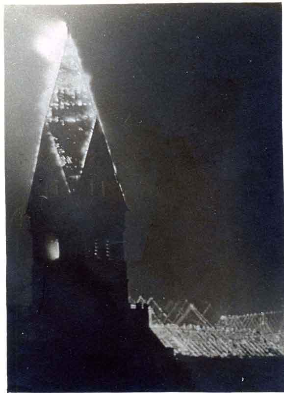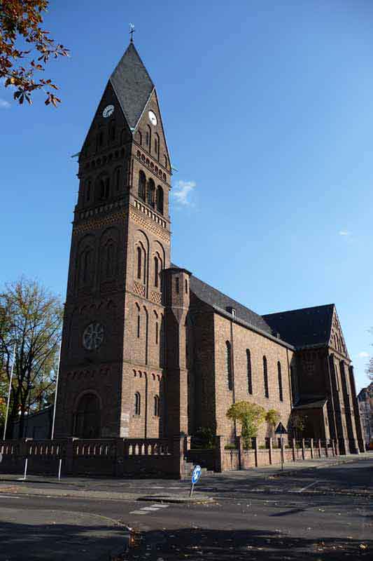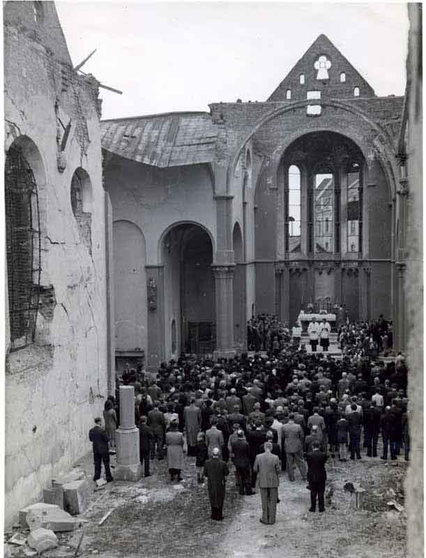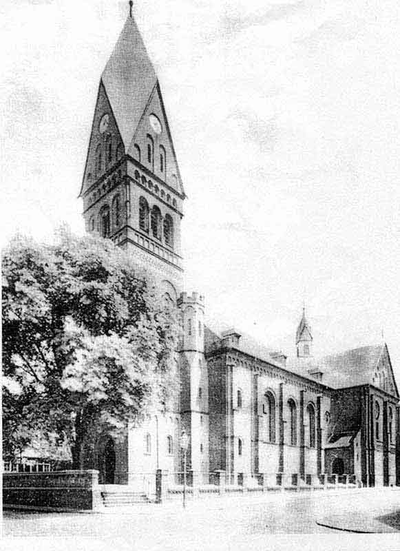 Die Bomben des 2. Weltkrieges zerstörten Kirchturmdach und Langhaus mit seinem reich verzierten Deckengewölbe. Erhalten blieben Apsis und Kirchturm mit ihrer verschiedenfarbigen Backsteinornamentik.
