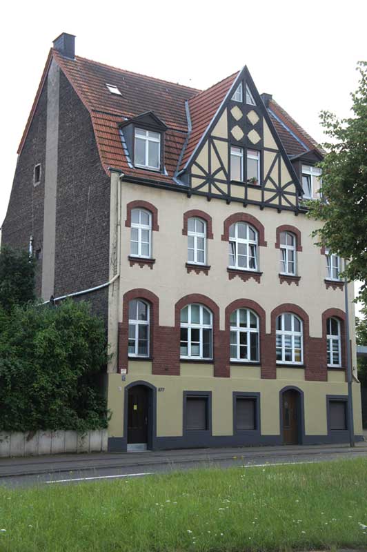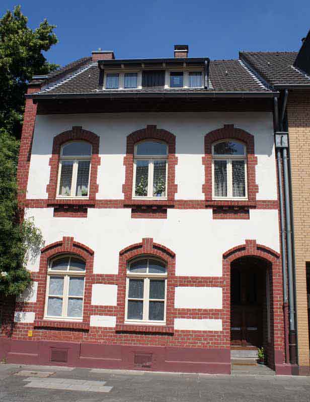 Bauherr war 1906 ein Maurermeister, der sich die Häuser in Neuehrenfeld zum Leitbild nahm, allerdings mit geringerer Geschosshöhe, Stockwerksanzahl, Fensterbreite und Vereinfachung der Schmuckdetails und des Giebelumrisses am Dorfhaus.
