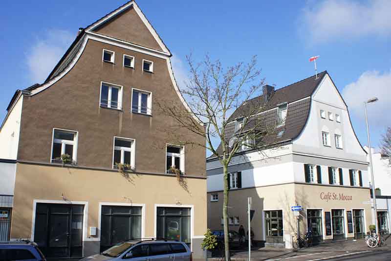 Das rechte der beiden Häuser präsentiert sich mit gelbroter Ziegelsteinfassade, das linke ist verputzt mit dezent abgesetzten Fenstereinfassungen, Toreinfahrt und schönem Schweifgiebel.