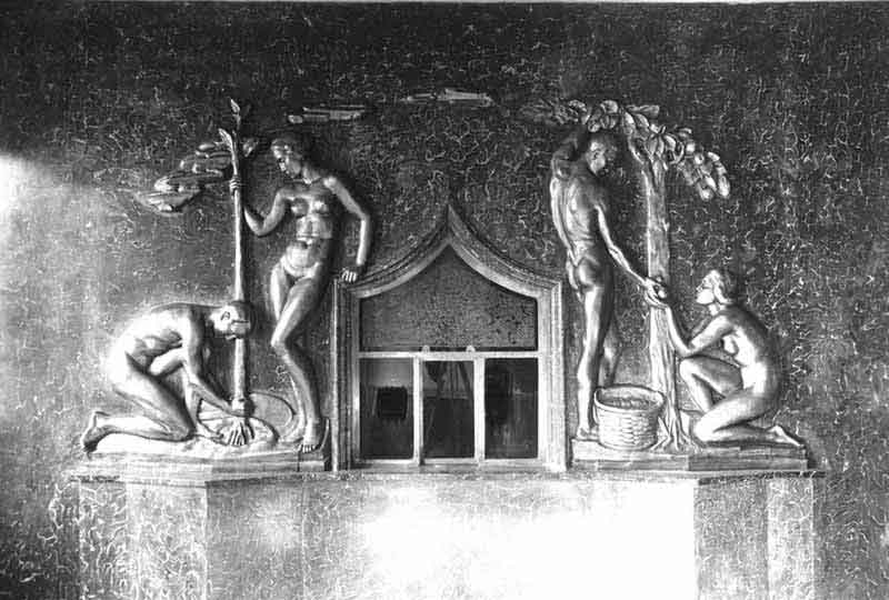 Neben der Treppe, die auf den Platz führt, sind zwei grobe Steinfiguren des Künstlers Jörg Barner auf dem Kopf stehend positioniert worden. Sie sollen Adam und Eva darstellen, die auf ihren Füßen das Weltall tragen. Die Figuren sind Schenkungen der GAG.