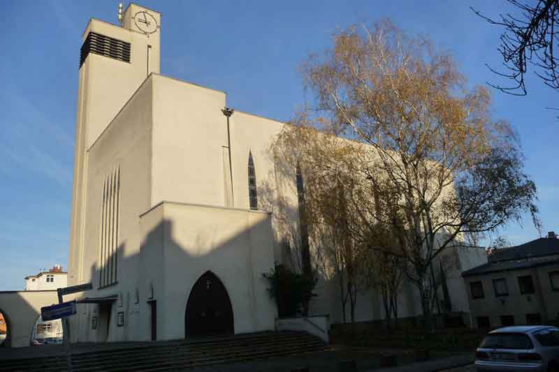 St. Dreikönigen wurde am 6. Januar 1929 geweiht. Die kubischen Formen von Turm und Gotteshaus sind den Häusern der Umgebung angepasst.