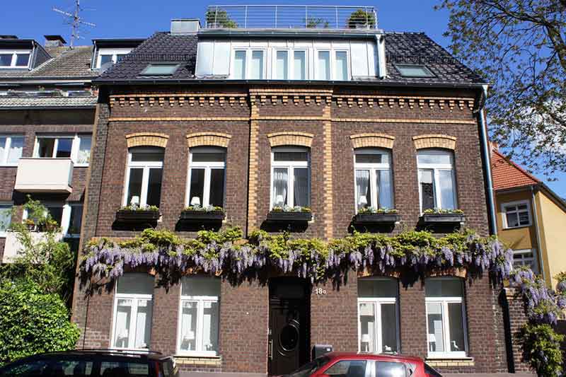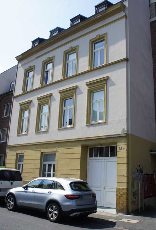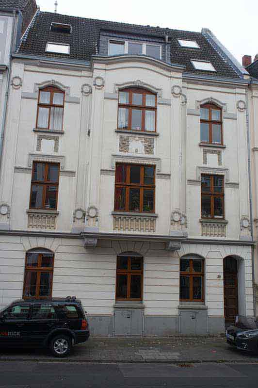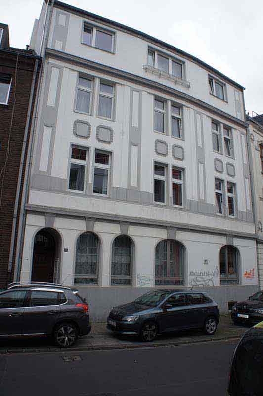 Hier erwarb ein bekannter Kölner Herrenausstatter ein brachliegendes Grundstück und ließ darauf einen repräsentativen Wohnbau nach Plänen des Architekten Rudolph Keveloh errichten. Passt sich die Frontseite den Nachbarhäusern an, so wartet die Hausrückseite mit architektonischen Besonderheiten auf. Zu nennen sind das großräumige Treppenhaus mit einem über zwei Etagen reichenden Fenster aus Kathedral- und Buntglas und das zum Garten sich öffnende Panoramafenster mit einem gerundeten Acrylglas in der Mitte.