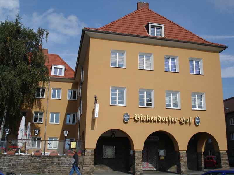 Die Gaststätte „Bickendorfer Hof“ wurde 1937 erbaut und entstammt mit ihren wuchtigen Rundbögen und Feldsteinen der späten Bauphase der Rosenhofsiedlung.