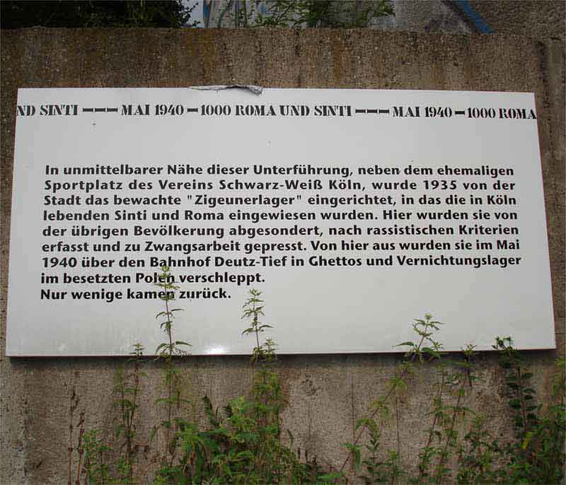Am 16. Mai 1940 wurden ca. 500 Sinti und Roma auf LKW verladen und über Köln-Deutz in die Ghettos nach Ostpolen verschleppt, wo die meisten an den Folgen der Misshandlungen starben.