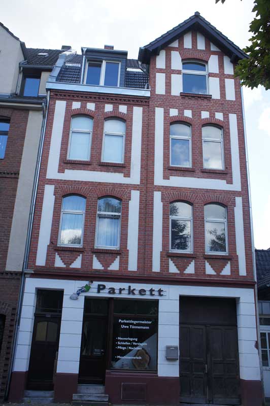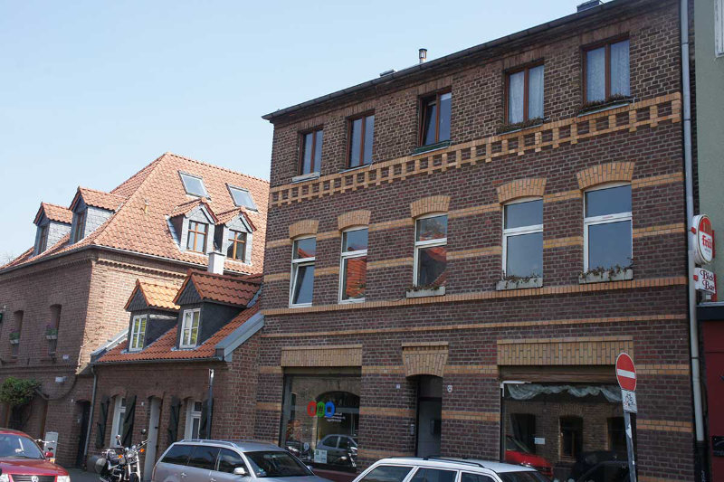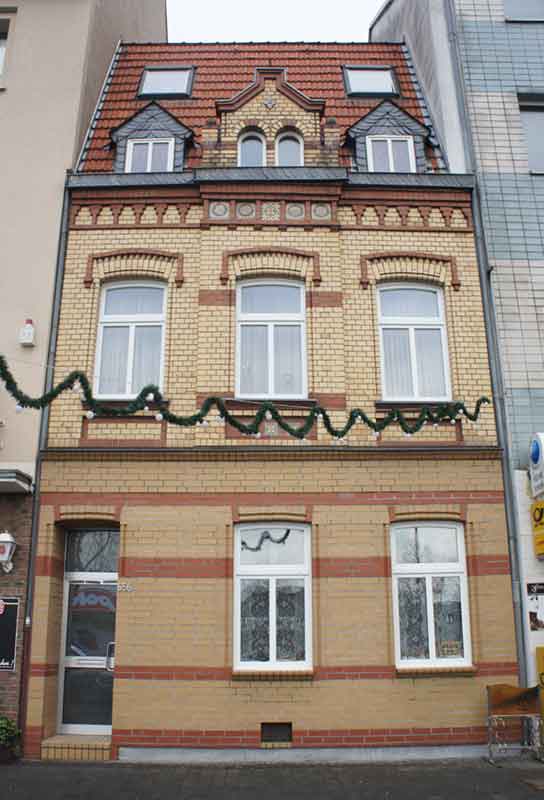 Am Übergang der Subbelrather Straße in den Sandweg steht ein markantes Wohn- und Geschäftshaus mit drei schönen Bogenfenstern im Erdgeschoss und einem geschwungenen Ziergiebel. Die Hausfront passt sich in seiner halbrunden Bauweise dem Verlauf der Straße an.